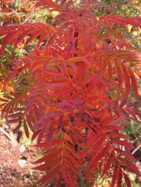 A distinct form we gathered seed of on the remote island of Ullüngdõ 80 km off the coast of South Korea in 2001. Where this small multi-stemmed tree only grew 3m tall in the exposed conditions. With distinctly robust branches bulging at their nodes bearing larger than normal luxurious bright glossy green serrated pinnate leaves which were transforming to an autumnal red. Complimented by a heavy crop of red fruit in small cymes at that time, succeeding the display of small white flowers. Easily grown in any well drained soil in sun or part shade.