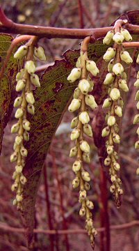 From our collection after leaving the Arun River behind us making an evasive detour, away from menacing so-called Maoists, in the upper Arun Valley in Eastern Nepal, with Dan Hinkley in 2002. A deciduous open shrub with strong young flexuous shoots bearing ovate long-pointed thin-textured leaves, quite different from our other collections gathered in this area. Producing overwintering pendant racemes of fat flower bud by late autumn, which open April-May. Height 3m spread 3m. Shelter, retentive soil.