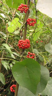 Tuberous rooted herbaceous twining climber to 3m long with slender stems and branches bearing peltate (umbrella-like) triangular- rotund thin textured leaves to 9 cm across with prominent venation, somewhat nasturtium like, but pale green on long petioles to 7 cm long that also twine. With separate male and female axillary congested clusters of tiny yellowish flowers borne late spring-summer followed by flattened green maturing bright red fruit, containing the crescent-shaped 'moon-seed' this group of climbers are named after. Best grown in sun-part shade in any fertile retentive but well drained soil.