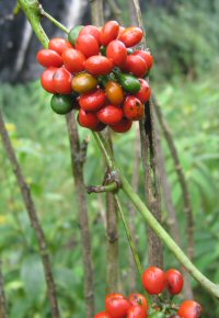 Tuberous rooted herbaceous twining climber to 4m long with slender stems and branches bearing peltate (umbrella-like) triangular-ovate thin textured leaves to 9 cm across, somewhat nasturtium like, but pale green sometimes pink tinted on long petioles that also twine. With separate male and female axillary congested cymes of tiny yellowish flowers borne late spring-summer followed by flattened green maturing bright red fruit, containing the crescent-shaped 'moon-seed' this group of climbers are named after. Best grown in sun-part shade in any fertile retentive but well drained soil.