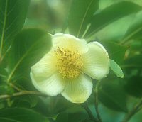Grown and admired in our garden for about 12 years without a name, where it has formed a small elegant tree to only 4m tall. With slender upwardly inclined branches from the upright slate grey to tan trunk. Bearing small elliptic papery textured leaves, which are finely serrated along their margins. With single white Camellia-like flowers carried in the leaf axils at a pendant inclination from May-June followed by rounded beaked seed capsules into the winter. Best grown in a lime free moisture retentive soil in part shade where the roots can be shaded from hot sun.